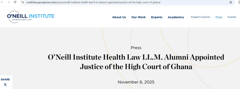 As a judge with a background in public health law, how do you see your expertise contributing to strengthening health systems and governance in Ghana?